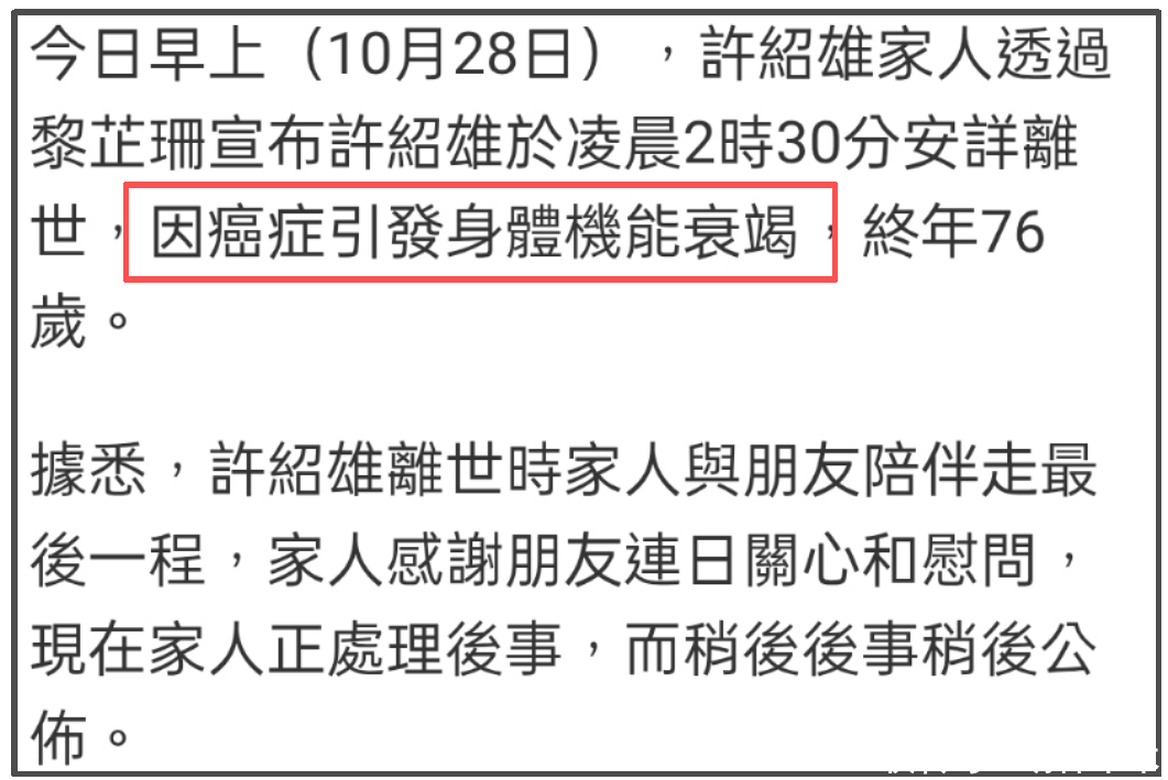 据悉,许绍雄在凌晨2点30分安详离世,因癌症引发身体机能衰竭,享年76岁。在离世最后,家人和朋友陪伴他走过这一程,家人感谢亲朋好友连日的宽慰,正在忙着处理后事,稍后家人也会对外公布消息。